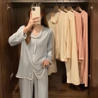 ins Korean style simple solid color long-sleeved pajamas for women in spring and autumn, with loose milk thread stripes and cross-border home wear for girls